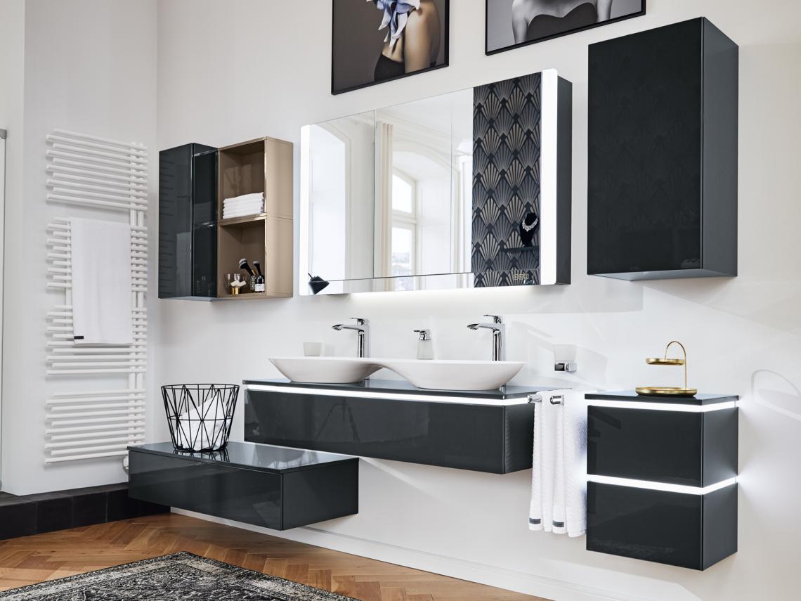 Alle Modelle verfügen über eine Waschtischbeleuchtung. Die über den Spiegeltüren eingesetzte horizontale LED-Beleuchtung kann als vorkragendes Lichtsegel oder als dezentes, bündig integriertes Lichtband gewählt werden. Zu der hochwertigen Innenausführung gehört unter anderem auch die neue E-Box mit Drehschalter zum Dimmen und zur Lichttemperatursteuerung, eine Steckdose und zwei USB-C-Ports.